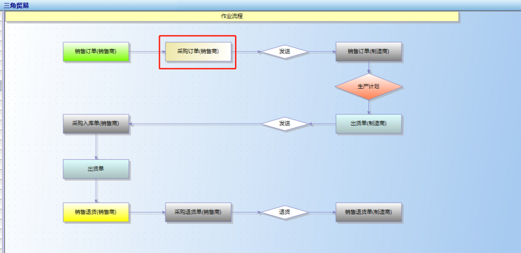 首先,三角贸易大多是跨域公司或者多个公司才会用到的功能,例如A公司总部在北京,它还有几个分公司,分别在其它的区域,这时候相互贸易或者信息共享的时候会产生数据关联,这时候就要用到多角贸易逻辑;